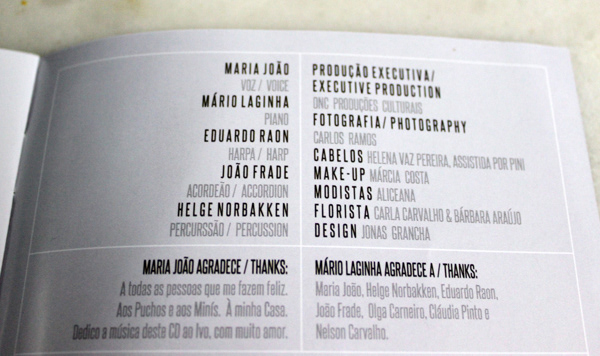 Four years after their previous studio record "Chocolate", Maria João & Mário Laginha make a comeback with a new work. It all started, the duo confesses, with an invitation from the Gulbenkian Foundation to be part of the foundation's "World Music" programme: "the idea came to us, of making new music and to combine instruments that we enjoy in an unusual ensemble: voice, piano, accordion, harp and percussion.